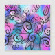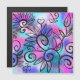 Een grappige kleine vogel in de linker bovenhoek en bloemelementen op een roze, paarse en turquoise achtergrond.