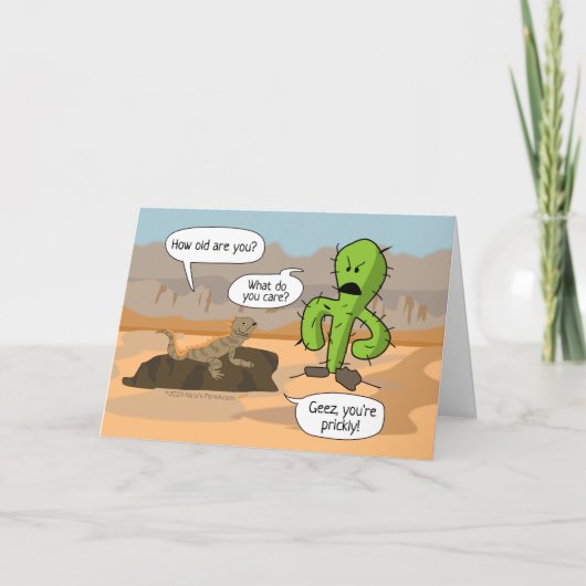 Dit humoristische wenskaart is perfect voor een griezelig oud man of vrouw, een senior of iedereen die een verjaardag heeft die gevoelig is voor veroudering. Het heeft een hagedis van de cartoon en boze cactus in de woestijn. Inside is de grappige punch line en zegt Happy Birthday. U kunt meer tekst toevoegen om aan te passen als u wilt. Bekijk meer grappige verjaardagswenskaarten voor ouderen, schrijvers, dansers, drummers, muzikanten, en nog veel meer op het Alina Pencil.