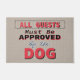 Familie en vrienden zullen een kaukel krijgen als ze deze grappige en grappige deurmat lezen. Moderne welkomstgasten met een duidelijke boodschap: alle gasten moeten door de hond worden goedgekeurd. Moderne, zwarte, rode, witte en blauwe typografische stijlvolle prijsopgave. Bruin getextureerde achtergrond.
