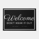 Geef uw gasten een warm, maar grappig welkom met dit persoonlijke design van een welkomstmat. Design heeft een blik van een eenvoudige welkomstvlek tot het goed leest dat het gasten ervan weerhoudt hun bezoek te overleven. Woorden die "welkom niet draag het uit" met familienaam en datum eronder. Het ontwerp kenmerkt grijs en wit kalligrafisch en modern schrijven op een zwarte achtergrond. Een witte grens sluit de brieven op de mat in. Ontwerp door © Ms_Jade. Bekijk andere leuke design in mijn Zazzle winkel op www.zazzle.com/Ms_Jade*