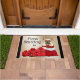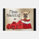Een schattige illustratie van een Franse bulldog in een levendige rode Santa-zak met een faux vacht en een glazen rode boog met faux goud heeft twee prachtig geschapen cadeaus in wit en rood naast het en de woorden, fleas navidog erboven. Het schattige ontwerp is gemaakt door een faux gouden achtergrond met twee verticale zwarte randen. Ideaal voor Yorkshire doodsliefhebbers en Xmas accessoires dit feestelijke seizoen.