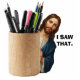 This is a graphic printed onto a flat 2D acrylic plastic sheet. For the statuette sculpture, the acrylic figurine is propped up on a little stand which is perfect for religious displays. // - // "funny humorous jesus meme", "i saw that humor joke", "jesus christ peeking behind", "pen pot holder jar", "pens pencils container gag", "2d flat statue statuette", "acrylic plastic office desk stand", "christian pop popping out", "god is always watching", "sees you catches everything",