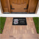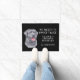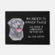 "We hoeven niet twee keer te kloppen, we hebben een labrador Retriever", verklaart deze schattige deurmat. De tekst is zilvergrijs aan de rechterkant, met een afbeelding van een zwarte Labrador Retriever aan de linkerkant. Alles wordt op een zwarte achtergrond geplaatst.