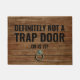Grappig welkom mat met een bedrukte houten achtergrond, deurkruk en het gezegde "GEDEFINIEERD GEEN TRAP DEUR...OF IS HET HET?"