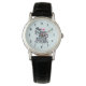 Een horloge met een schattig en komisch gezegde. Typografische tekst zegt: Deze superheld draagt schrobben. Ontworpen met een lichtblauwe stethescoop en een groot roze hart en een roze hartmonitor. Een lichtblauwe achtergrond met getande roze stempels.