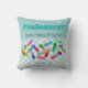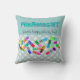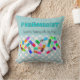 Funny Pharmacist Pillow "Telt Happy Pills by Five", kunstenaar tekende kleurrijke capsules met smiley gezichten op een lichtblauwe polka stip en blauwe achtergrond. Geweldig cadeau voor PharmD afstuderen.
