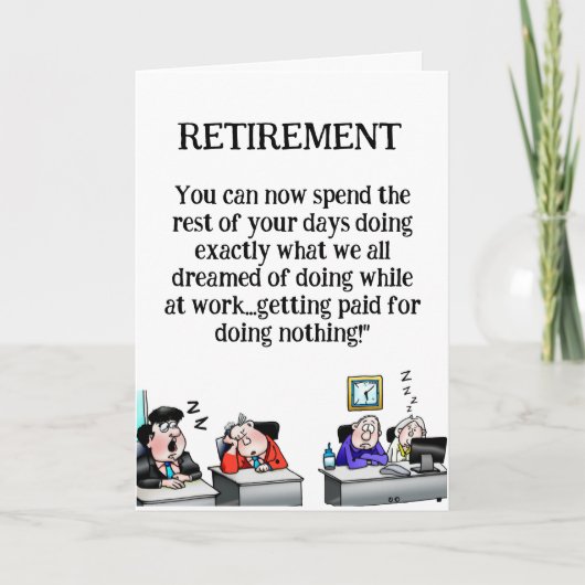 Een grappige pensioenkaart. "Gefeliciteerd met je pensioen! Je kunt nu de rest van je dagen doen wat we allemaal droomden van doen tijdens je werk...betaald worden voor niets doen!"