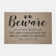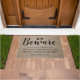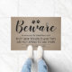 Grappig deurmat met een rustige bruine burlap-effect achtergrond, pootafdrukken, het woord "Beware" in een elegant calligrafielettertype en humoristische gezegden over honden in je huishouden!
