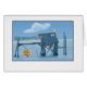 Dit kleine tafereel van een waterfront, compleet met satellietschotels op het dak, is bedoeld om een glimlach te maken.