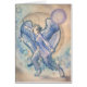 Gabriel, met kort donker haar en grote blauwe vleugels, houdt een zwaard vast in een gevechtshouding, draagt moderne stadskleding, sneeuwvlokken die rond haar in een stadscern ronddrijven, met een grote stad op afstand. De grote maan ligt achter haar. Verbijten van blauw en warm grijs domineren het schilderij. Waterverf- en inkepen schilderen op waterverf papier met hete pers, uit mijn archangelserie, waaronder Gabriel, St Michael, Raphael en Uriel.
