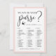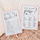 De grafische kaart van het vrijgezellenfeest past ons collectie van het vrijgezellenfeest van de Romance van Parijs aan en kenmerkt wit zwarte manuscriptletters en zachte, wazige roze grenzen met de toren van Eiffel en kleine vogelaccenten. Met de dubbele kaart kun je twee games in één spelen! Voorzijde: Hoe goed ken je de bruid en terugkeren naar wat er in je tas zit. Pas de bruid aan om de naam en de datum van de douche te zijn.
