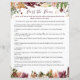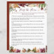Dit is een rustieke en elegante herfst thema "Pass the Poem" vrijgezellenfeest spel kaart. Het maakt gebruik van een modern waterverf herfst bloemen- en gebladerte ontwerp en een vrouwelijk handgeschreven script. Het kleurenpalet beschikt over rijke herfstkleuren zoals bordeaux, verbrand sinaasappel, terracotta, diepgroen, bessen en goud. Pas eenvoudig alle tekst naar wens aan met behulp van de meegeleverde tekst sjabloon. Neem contact op met de ontwerper als u vragen hebt over dit ontwerp of voor overeenkomende producten die niet beschikbaar zijn.