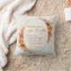 Kussen met een volmaakt schriftvers voor Thanksgiving uit 1 Thes 5:18: "Geef in alles bedankt; want dit is de wil Gods in Christus Jezus aangaande u", omgeven door een eenvoudige herfst pompoenkrans.