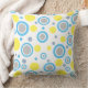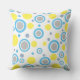 Geometrisch patroon met hemelsblauwe cirkels die wit en zilver schetsen, en verschillende maten blauw, leigrijs, gele stippen tegen helder wit aan de voorkant. De achterkant is effen leisteen grijze kleur. Leuke trendy moderne home decor. Originele design van TamiraZDesigns.