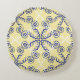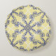 Ronde gooi kussen met een patroon in lichtgeel, blauw van de marine, en wit. Gedetailleerd en ingewikkeld scrollwork-ontwerp.