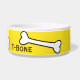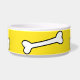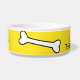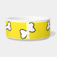 Witte keramische hondenvoer / waterkom, met geel, rond de buitenkant. Afbeeldingen van cartoon botten, lopen rond de buitenkant van de kom. Zwarte aangepaste tekst, op de voorkant, is klaar om te personaliseren, voor uw huisdier of als een geweldig cadeau-idee voor elke huisdiereneigenaar. Overeenkomende huisdier producten zijn beschikbaar.