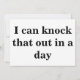 Standaard witte kaart met "Geen probleem!" op de voorkant en "Ik kan dat in een dag uitkloppen" op de achterkant. De tekst staat aan beide zijden in een groot vet zwart lettertype.