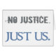 "Geen gerechtigheid" in een grijs grijze lettertype. "Alleen ons" in een schoner poederblauw lettertype.