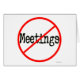 Geen sarcastische slogan van de kantoorhumor van Vergaderingen in vervormde letters met een rode cirkel en een lijn. Word niet opgesloten in een vergadering op het werk, show ze hoe je je echt voelt met dit grappige gezegde.