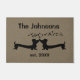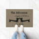 Deurmat met zwarte deklandsilhouettes tegen een canvas bruine textuurachtergrond. Drijvende harten show de doxies in de liefde. Aanpassen met jouw naam en huwelijksjaar.