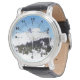 Een schilderij van een sneeuw bedekte bergtop die het lichaam is van drie jonge berggeiten. Deze winterbergscène kenmerkt kleine groepjes pijnbomen en een mooie blauwe hemel. Kunstwerk ©2017 Kimberly J Tilley.