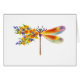 Artistiek beschilderde, bloemige libel in contrasterend sinaasappel en paarse met geel, fel, bloeiende Californische papaver en blauwe wilde bloemen op een witte achtergrond.