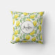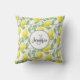 Een kussen gepersonaliseerd met een monogram initiaal en naam in een witte cirkel met een zwarte rand. Ontworpen met gele citroenen en groene bladeren, in een herhalend patroon.
