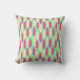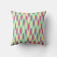 Deze werpkussens hebben een geometrisch ontwerp van een achtergrond van zee-groene en lichtblauwe rechthoeken met gele en roze ovalen bovenaan.