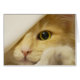 Foto van een gele Noorse boskat die onder een blad naar buiten kijkt.