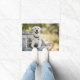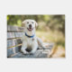 Een gele Labrador Retriever-hond glimlacht terwijl hij zich op een houten bank in de openlucht op een zonnige dag bevindt.