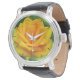 Een enkele diepe gele Rose tegen een zwenkgroene achtergrond