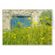 Gele waterverf bloemen in bloesems met blauw houten deur en steenwand