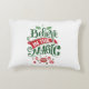 Een kussen met een schattige illustratie. De tekst zegt Gelooft in de Magie in fancy letters. Gedrooid met kerstballen.