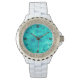 Dameshorloge in een edelsteen plakpatroon van blauw Larimar of blauw pectolite, ook wel de "Atlantis steen" genoemd, in een zijdeachtig patroon van zacht hemelsblauw en aqua