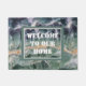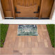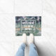 Deze welkome mat voor uw voordeur is voorzien van een foto die de prachtige kleuren in een gepolijst stuk fluoriet weergeeft. Deze gemstone toont kleuren van paars, groen en geel in een gestreepte patroon met de unieke kubieke kristallen van deze gem. "Welkom bij ons thuis" verschijnt in een rechthoekig lijst in het midden van deze deur.