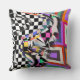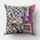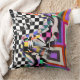 A warped checkered pattern with a collage of abstract geometric shapes.