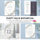 Romantische waterverf stoffige blauwe bloemen en bladeren op gouden geometrische lijsten. Voeg uw trouwgegevens toe, wijzig lettertypekleuren, grootte of tekenstijlen. Dit moderne botanische, elegante ontwerp is ideaal voor lente- en zomerbruiloften.