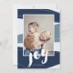 Het hedendaagse ontwerp van kleurenblokken in wintertinten van denim blauw bevat een met de hand geschreven boodschap voor vreugde in deze moderne, gestileerde vakantiefoto.