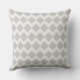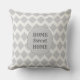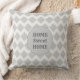 Mooie grijze geometrische diamantpatroon op een bijna witte achtergrond. De voorkant van de kussen heeft een grote grijze stip met de tekst: Home Sweet Home.