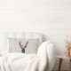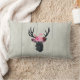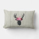 Een lumbaal kussen met een zwarte hertenkop gemaakt met geometrische lijnen en met een roze bloemenkroon. Rustiek en trendy design. De achtergrond is een digitaal afbeelding van een houten textuur.