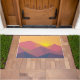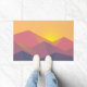 Deurmat met een grafische illustratie met veel topjes in de bergen met felgeel zonlicht. Gemaakt van geometrische veelhoekige vormen.Eenvoudig minimalistisch ontwerp. De kleuren variëren van donkerblauw tot woestijnrood.