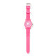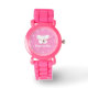 Gepersonaliseerd meisje horloge | vlindersilhouet. Kinder horloge met witte vlinder | met naam. polshorloges voor kinderen. Leuk verjaardagscadeau idee voor meisjes. Silhouet van dierlijk insect. Roze achtergrond.