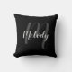 Een gepersonaliseerde monogram en een kussen van de Naam die gepersonaliseerde naam in witte moderne manuscriptdoopvontstijl en monogram in zwarte moderne manuscriptdoopvontstijl op een zwarte achtergrond kenmerken. Perfect als een vakantiecadeau, gezinshereniging voor mensen, het huisopwarmingsgeschenk, je cadeau voor bruidsmeisjes, of een van je thuisdecor behoeften.