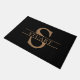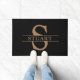Deze moderne en klassieke zwarte gepersonaliseerde welkomstmat is voorzien van uw monogram initiaal en uw familienaam in lichtbruine klassieke typografie op een zwarte achtergrond.