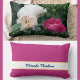 Lumbaal kussen met twee crème rozen en een prachtig roze gestreept roos. Met een gepersonaliseerde naam in een elegant cursief handschrift / kalligrafie.