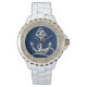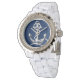 Persoonlijke neushoorn met zilveren anker. Voeg jouw naam aan dit nautische horloge toe of verlaat de spatie van het naamgebied als u slechts het ontwerp nodig hebt. Feminine, elegante neushoorn kijkt met witte riem en nautisch anker gezicht.