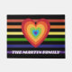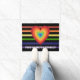 Heldere regenboogstrepen en op retro-stijl gepersonaliseerde doormat- Cute Huwarmer cadeau voor nieuwigheden en hippies. Gepersonaliseerd, welkom model met aangepaste familienaam onderaan in retrostijl, wit lettertype. Retrostijl, regenboogkleurig hart. De achtergrond is helder, kleurrijk regenboogstreekpatroon op zwart. Verander de zwarte achtergrondkleur als u wilt of stijl en/of kleur wilt letterzetten. We hebben meer regenboogstrepen decor in onze Zazzle.com/angela65* winkel.