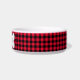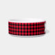 Deze unieke als huisdier gehouden hond of kat bowl kenmerkt hun naam gepersonaliseerd in klassieke petten serif tekst met een bijtende boerderij buffalo plaid check patterned background in rode en zwarte kleuren. Een stijlvolle waterkom en voedselbak voor uw drijfmestfamilielid, beschikbaar in middelgrote en grote afmetingen.