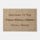 Ontwerp op deze indoor-outdoor deurmat creëer illusie van handgesneden stenen tegels in tinten van zand, bruin & amandel, gerangschikt in een klassiek waaiervormig (of clamshell) patroon, vaak gezien in opritten & looppaden van luxe herenhuizen. 3 aangepaste tekstvelden klaar voor u om die standaard te personaliseren naar: "Welkom bij de", "(Uw familienaam)" & "Familie huis!"