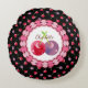 Dit zoete ronde kussen is verfraaid met een levendig motief van kersen met een waterverf vulling in rode en paarse tinten, samen met gemakkelijk te personaliseren tekst.